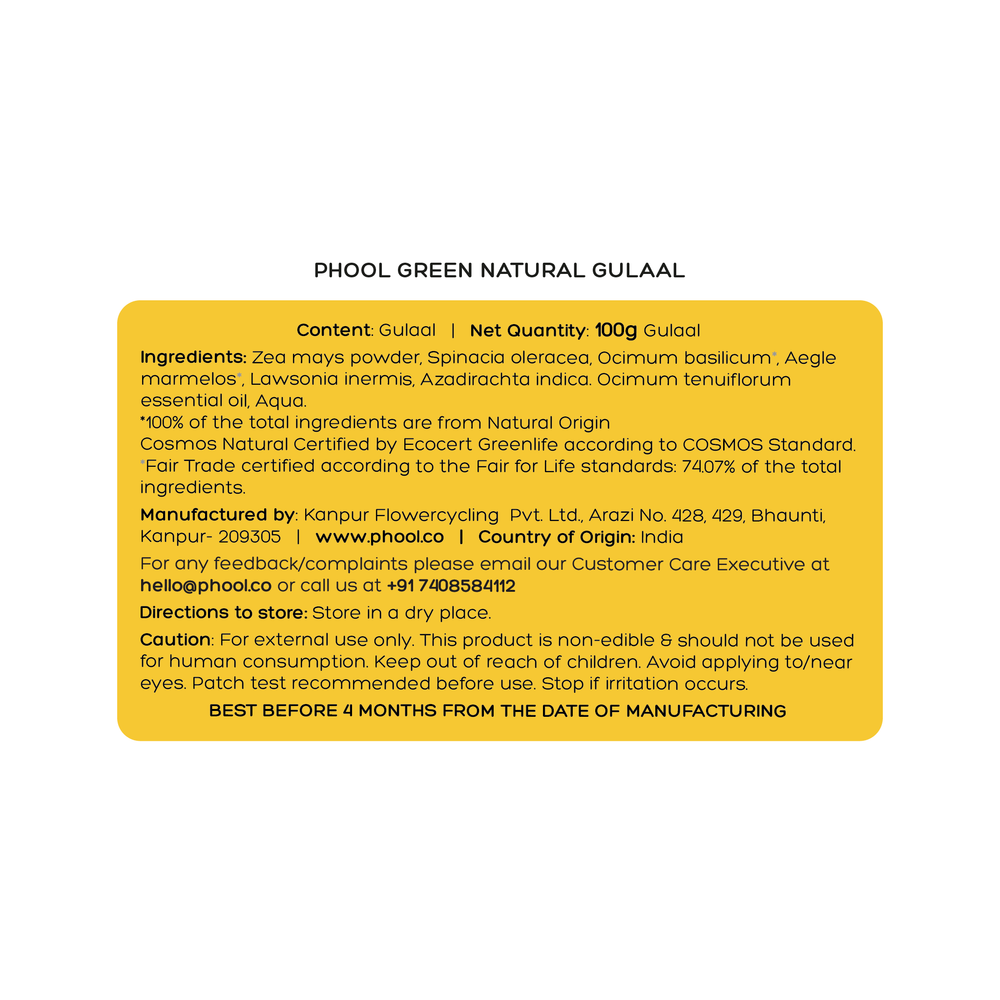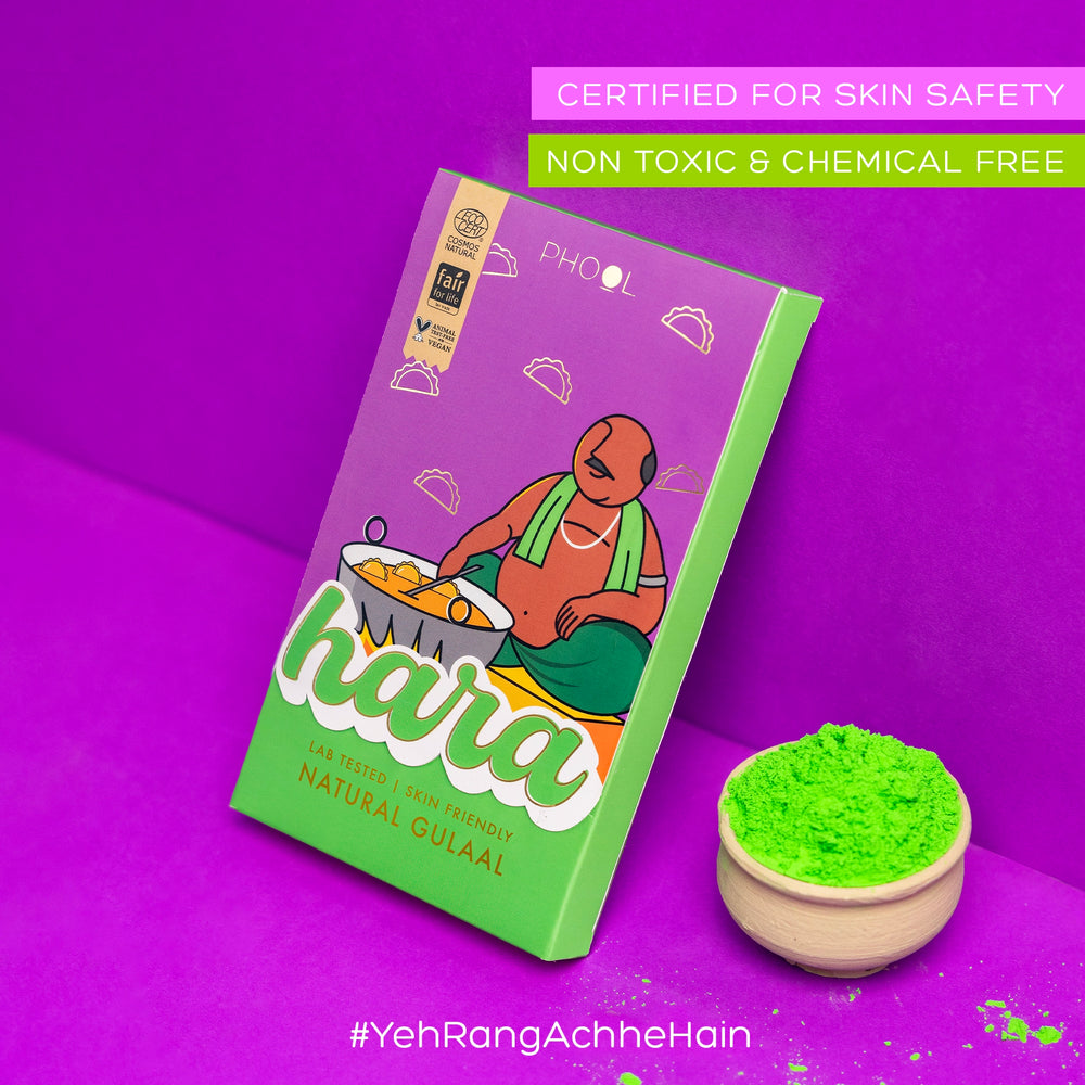 - Unlike the toxic chemical based Gulaal commonly sold in the market, Phool Organic Gulaal is 100% chemical-free.