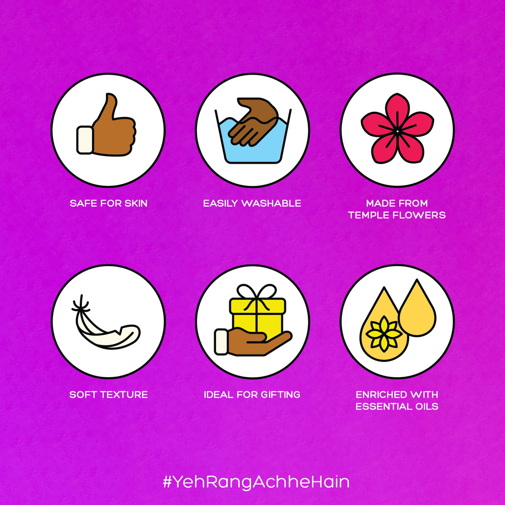 - Made from flowers collected from temples and natural ingredients sourced directly from local farmers, we use fresh raw material to give bright beautiful hues to the Gulaal.